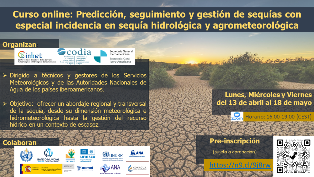 CODIA y CIMHET se complacen en anunciar la próxima celebración del curso "Predicción, seguimiento y gestión de sequías con especial incidencia en sequía hidrológica y agrometeorológica". Con esta actividad se busca generar un abordaje transectorial de las sequías y contribuir a la mejora de la gestión de este fenómeno a nivel regional.